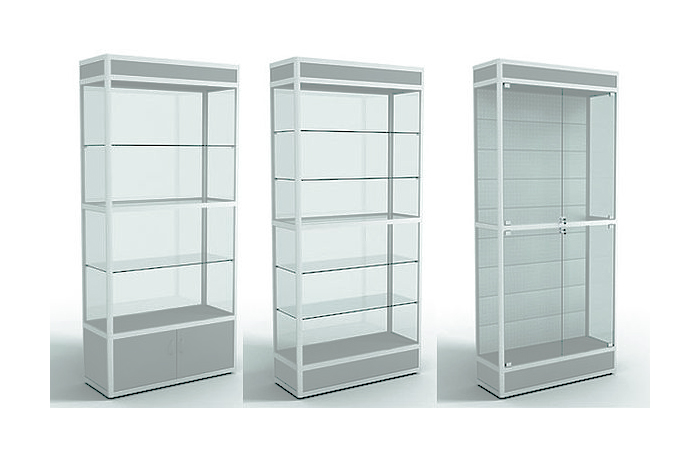 Витрина может состоять из нескольких секций. Вся из стекла, максимально прозрачная со всех сторон, с закрытой задней стенкой: стекло, ХДФ, уклеенная плёнкой ORACAL, в ваш фирменный цвет, эконом панель на которую Вы сможете повесить товар, зеркало, которое расширит визуально пространство.
