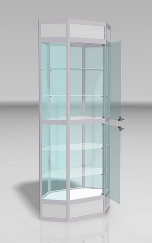 Витрина может состоять из нескольких секций. Вся из стекла, максимально прозрачная со всех сторон, с закрытой задней стенкой: стекло, ХДФ, уклеенная плёнкой ORACAL, в ваш фирменный цвет, эконом панель на которую Вы сможете повесить товар, зеркало, которое расширит визуально пространство.